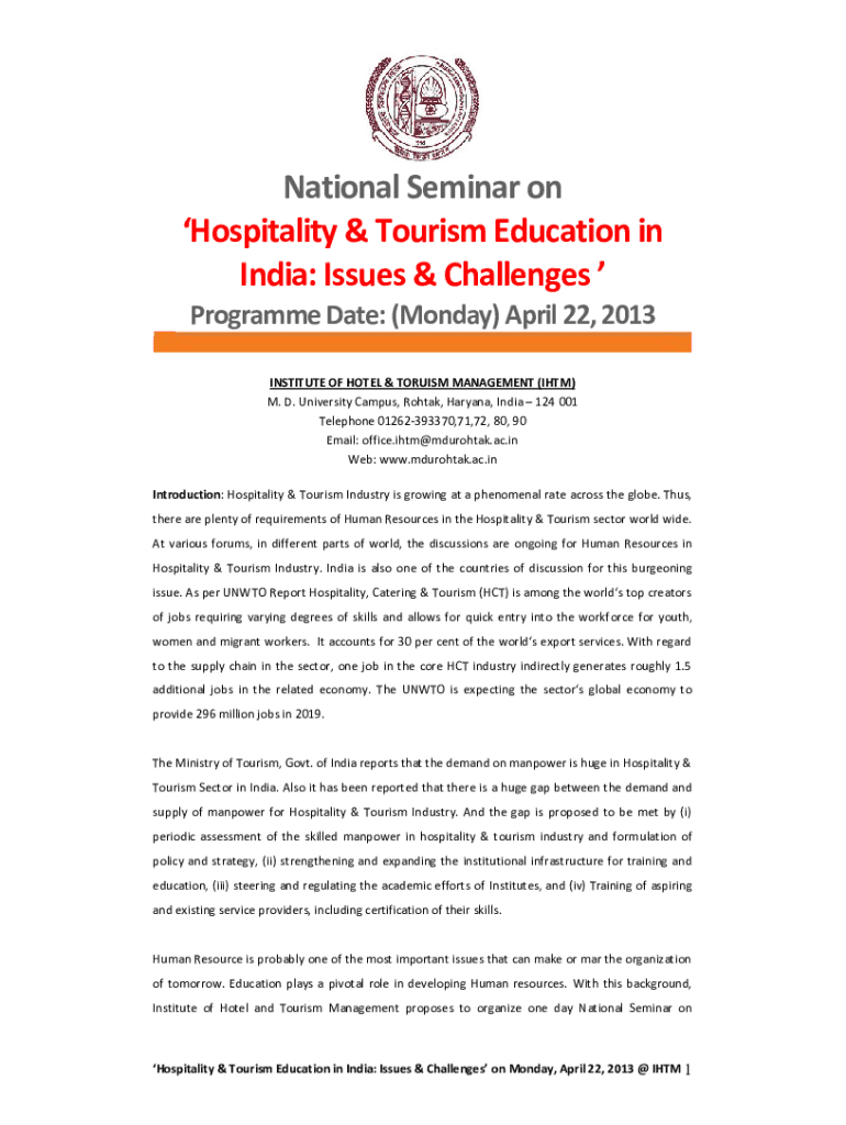 National Seminar on Hospitality & Tourism Education in India: Issues & Challenges Program Date: (Monday) April 22, 2013, INSTITUTE OF HOTEL & TRUISM MANAGEMENT (IHT) M. D. University Campus, Rota,