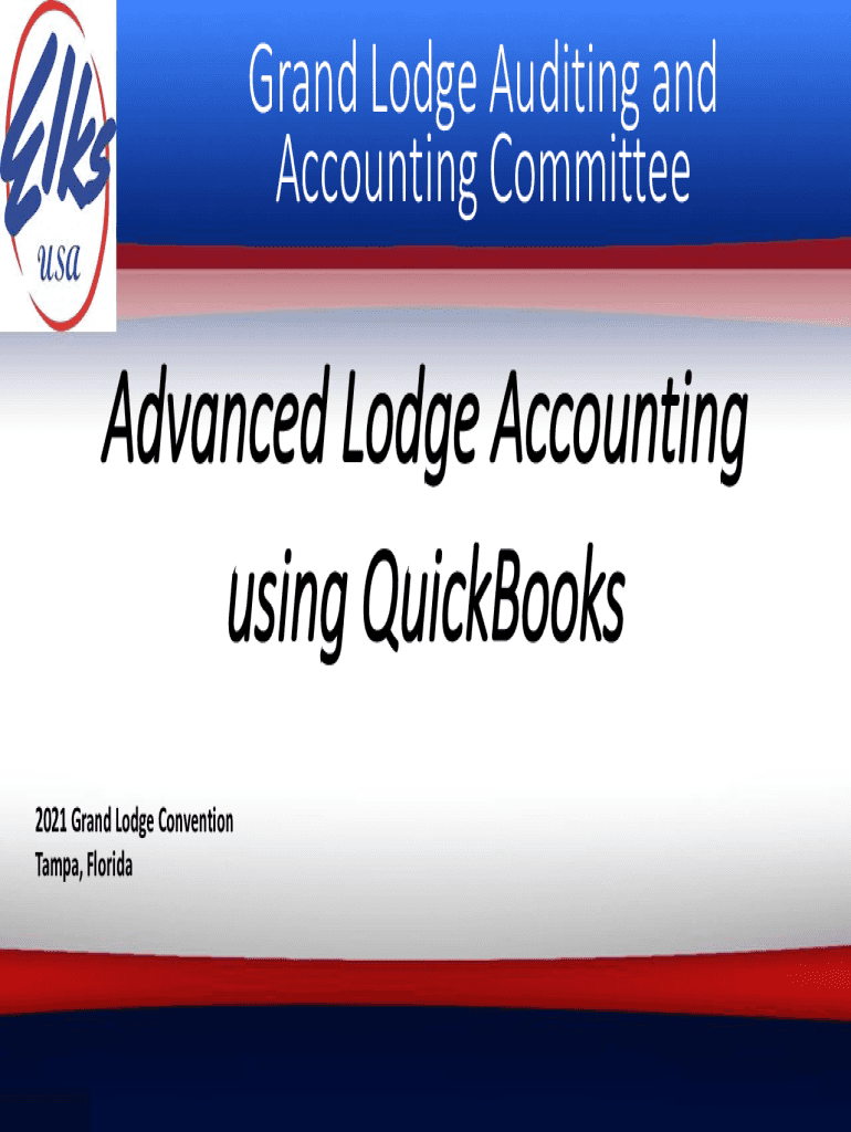 Grand Lodge Auditing and Accounting CommitteeAdvanced Lodge Accounting using QuickBooks 2021 Grand Lodge Convention Tampa, FloridaAuditing and Accounting Seminar Advanced Accounting Using QuickBooksAgenda