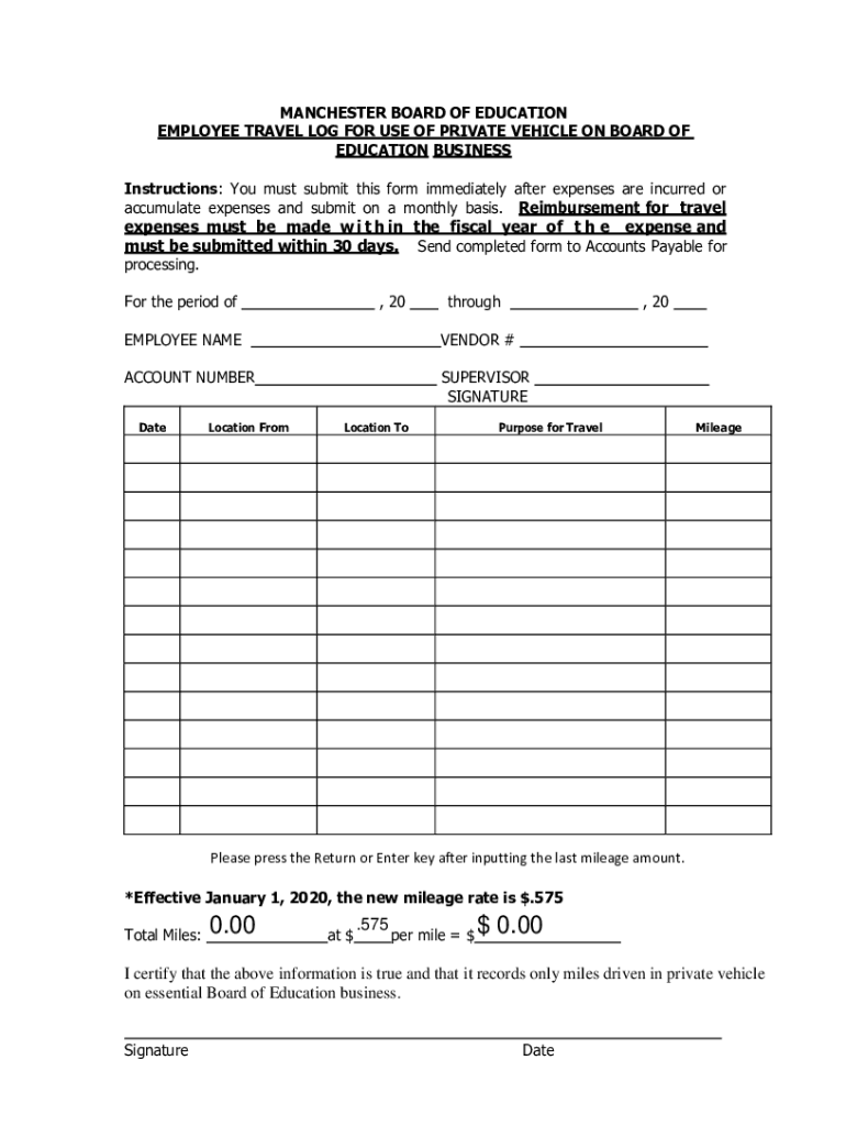 MANCHESTER BOARD OF EDUCATION EMPLOYEE TRAVEL LOG FOR USE OF PRIVATE VEHICLE ON BOARD OF EDUCATION BUSINESS Instructions: You must submit this form immediately after expenses are incurred or accumulate