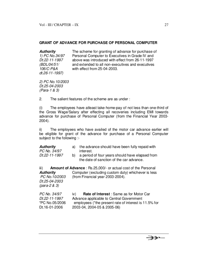 Vol III / CHAPTER IX27GRANT OF ADVANCE FOR PURCHASE OF PERSONAL COMPUTER Authority 1) PC No.34/97 DT.22111997 (BDL/04/51/ 106/CPA DT.26111997)The scheme for granting of advance for purchase of Personal