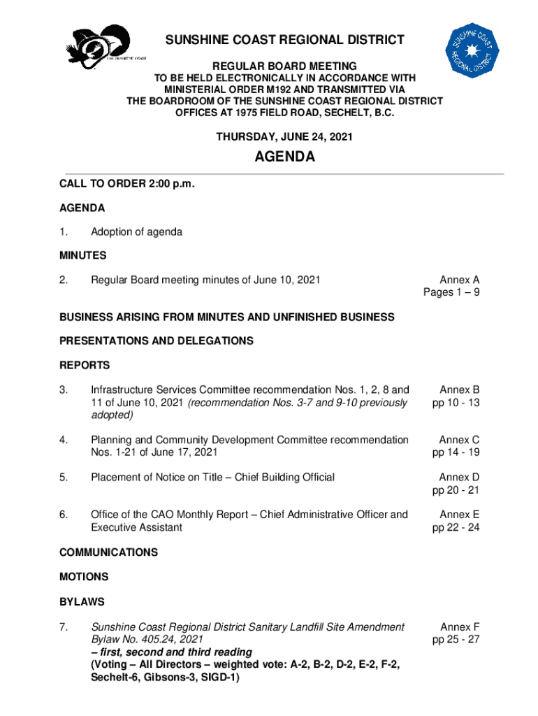 SUNSHINE COAST REGIONAL DISTRICT REGULAR BOARD MEETING TO BE HELD ELECTRONICALLY IN ACCORDANCE WITH MINISTERIAL ORDER M192 AND TRANSMITTED VIA THE BOARDROOM OF THE SUNSHINE COAST REGIONAL DISTRICT