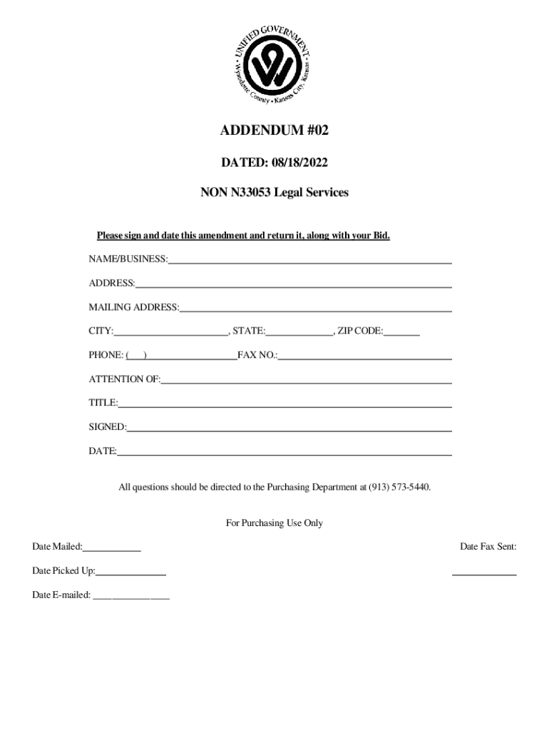 ADDENDUM #02 DATED: 08/18/2022 NON N33053 Legal Services Please sign and date this amendment and return it, along with your Bid. NAME/BUSINESS: ADDRESS: MAILING ADDRESS: CITY:, STATE:PHONE: (), ZIP