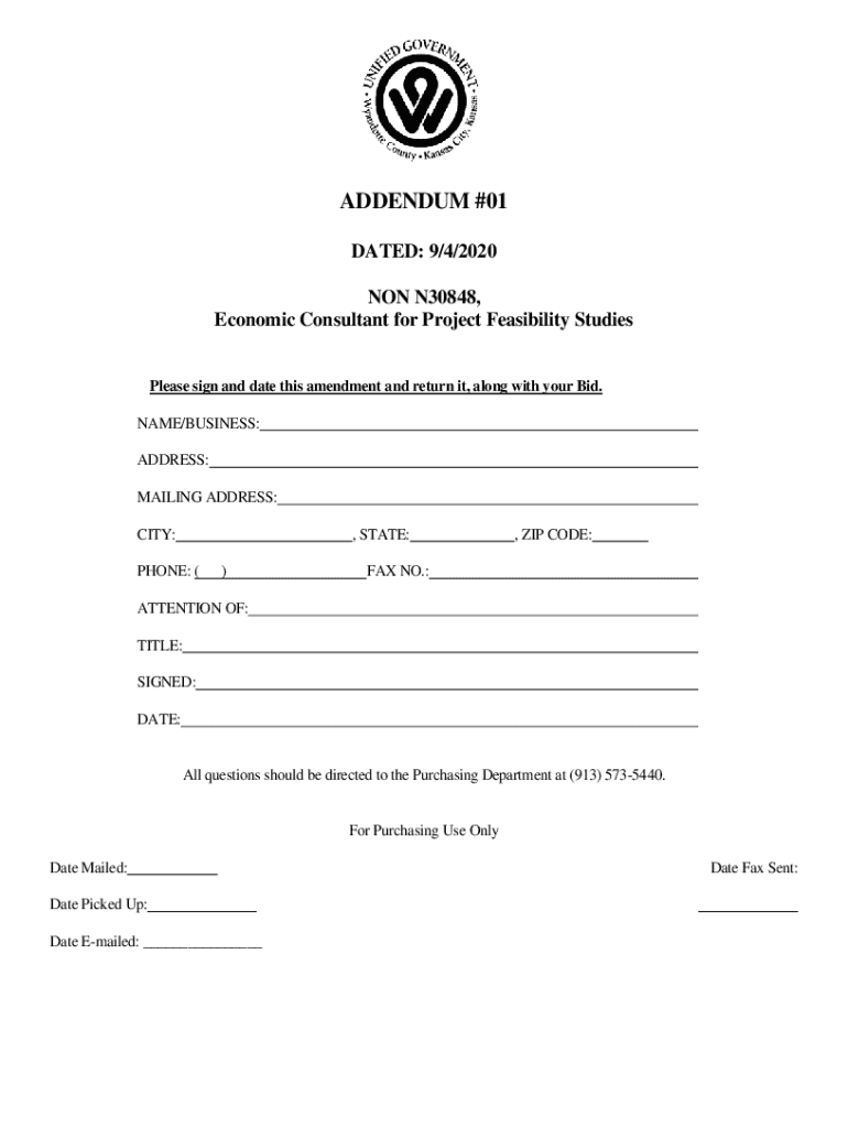 ADDENDUM #01 DATED: 9/4/2020 NON N30848, Economic Consultant for Project Feasibility StudiesPlease sign and date this amendment and return it, along with your Bid. NAME/BUSINESS: ADDRESS: MAILING