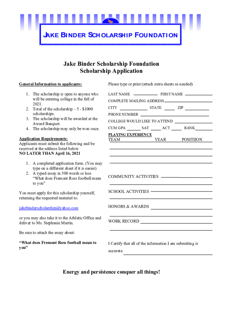 Get the free jake binder scholarship foundation - Fremont City Schools