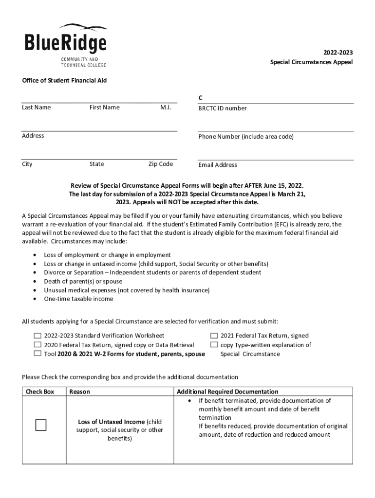 Special Circumstances AppealOffice of Student Financial Mideast NameFirst Name. I. Address CBR CTC ID numberPhone Number (include area code)CityStateZip Voicemail AddressReview of Special