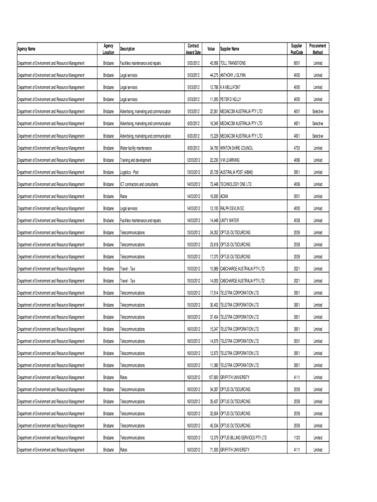 MethodDepartment of Environment and Resource ManagementBrisbaneFacilities maintenance and repairs5/03/201243,956