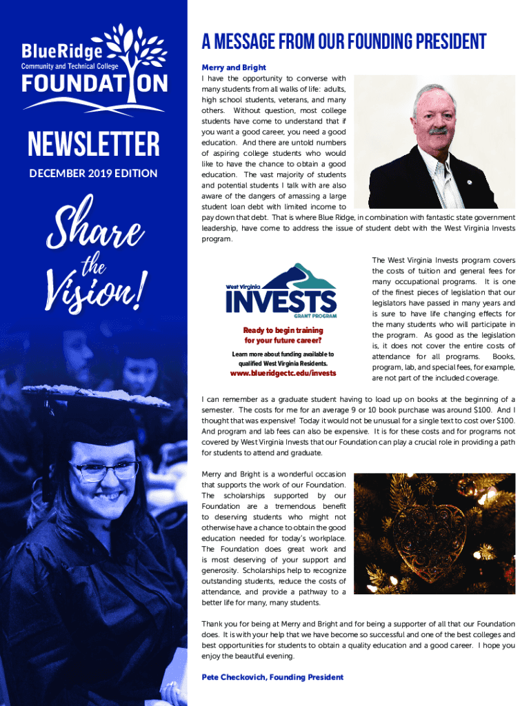 A MESSAGE FROM OUR FOUNDING PRESIDENT Merry and BrightNEWSLETTER DECEMBER 2019 EDITIONS hare the Vision! I have the opportunity to converse with many students from all walks of life: adults, high