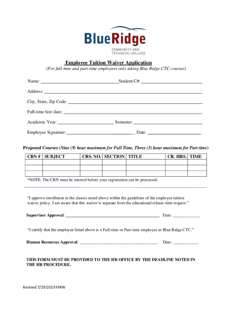 Employee Tuition Waiver Application (For full time and part-time employees only taking Blue Ridge CTC courses) Name:Student C#:Address: City, State, Zip Code: Full time hire date: Academic Year: Employee