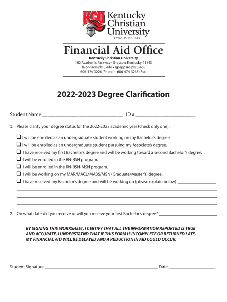 ESTABLISHED 1919Financial Aid Office Kentucky Christian University 100 Academic Parkway Grayson, Kentucky 41143 tajohnson@kcu.edu sjpeppard@kcu.edu 6064743226 (Phone) 6064743268 (Fax)20222023 Degree