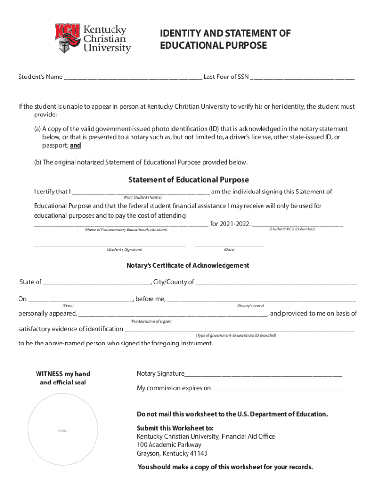Kentucky Christian UniversityIDENTITY AND STATEMENT OF EDUCATIONAL PURPOSEStudents Name ___ Last Four of SSN ___If the student is unable to appear in person at Kentucky Christian University to verify