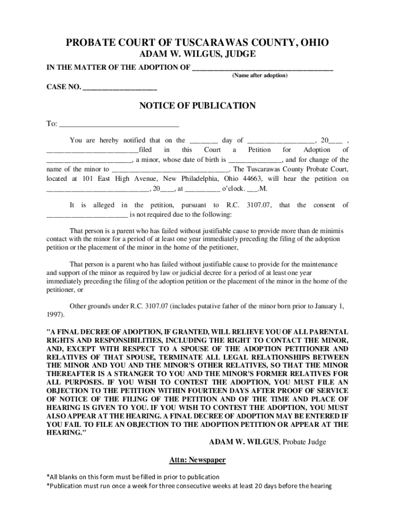 PROBATE COURT OF TUSCARORAS COUNTY, OHIO ADAM W. WINGS, JUDGE IN THE MATTER OF THE ADOPTION OF ___ (Name after adoption)CASE NO. ___NOTICE OF PUBLICATION To: ___ You are hereby notified that on the