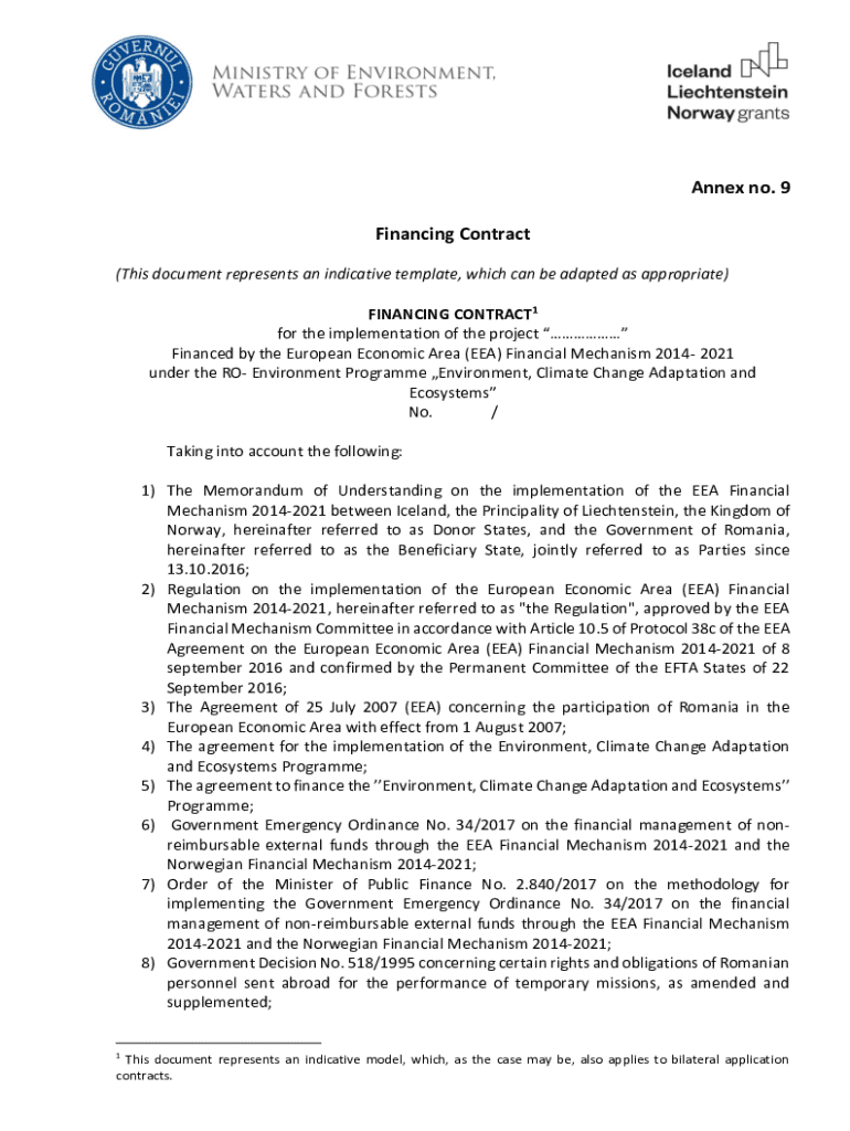 Annex no. 9 Financing Contract (This document represents an indicative template, which can be adapted as appropriate) FINANCING CONTRACT1 for the implementation of the project Financed by the European