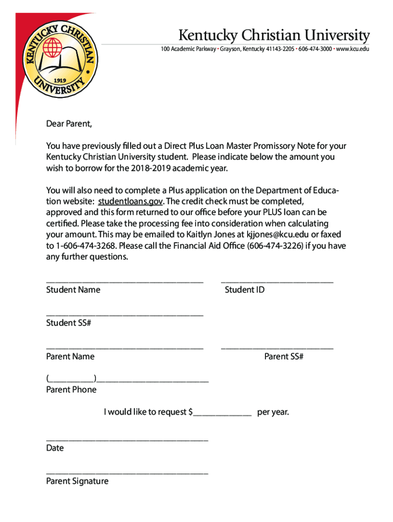 Kentucky Christian University 100 Academic Parkway Grayson, Kentucky 411432205 6064743000 www.kcu.eduDear Parent, You have previously filled out a Direct Plus Loan Master Promissory Note for your