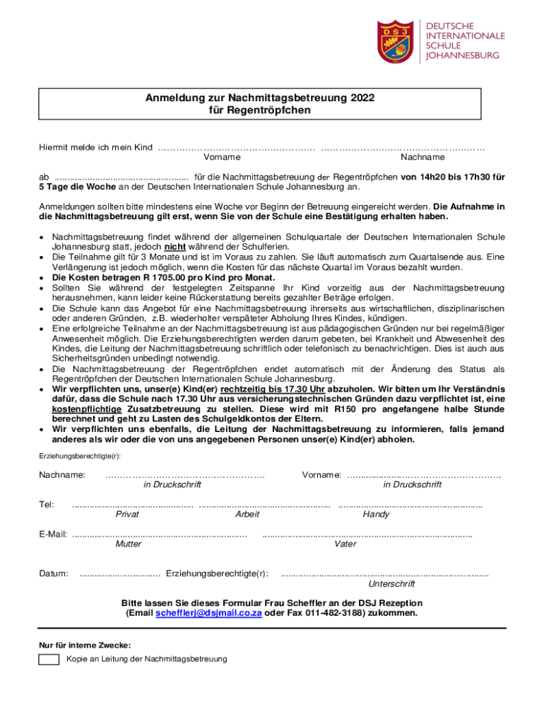 ab ..................................................... for die Nachmittagsbetreuung her Regentrpfchen