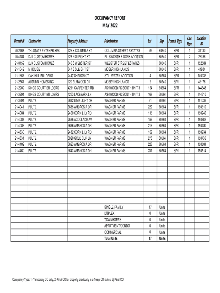 OCCUPANCY REPORT MAY 2022 Permit # 202765 204184 210159 211042 211853 212561 212909 213294 213894 214041 214084 214085 214086 214330 214331 214402 214460ContractorProperty AddressSubdivisionTRISTATE
