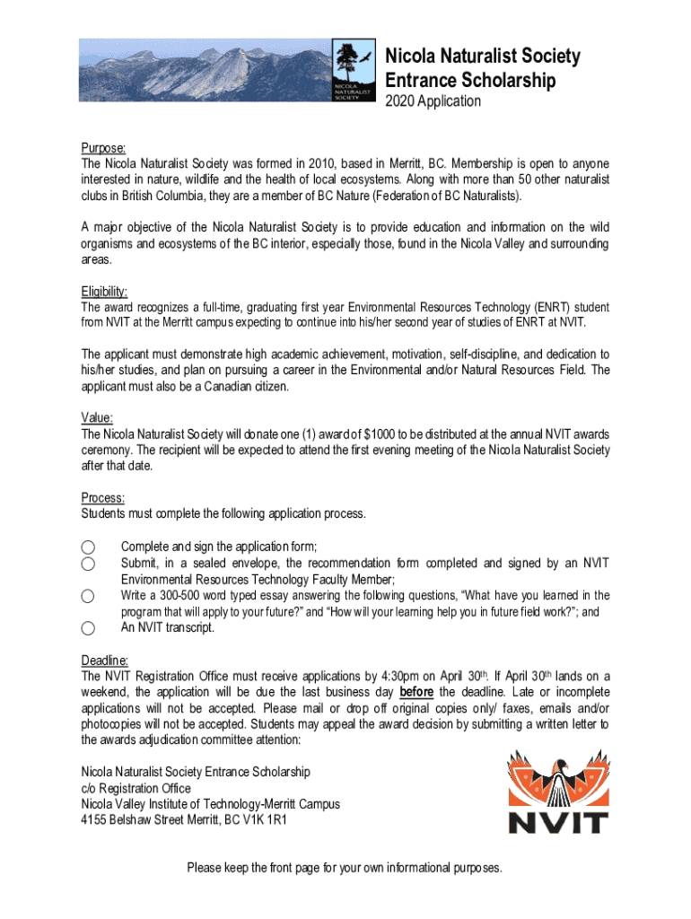 Nicola Naturalist Society Entrance Scholarship 2020 Application Purpose: The Nicola Naturalist Society was formed in 2010, based in Merritt, BC. Membership is open to anyone interested in nature,