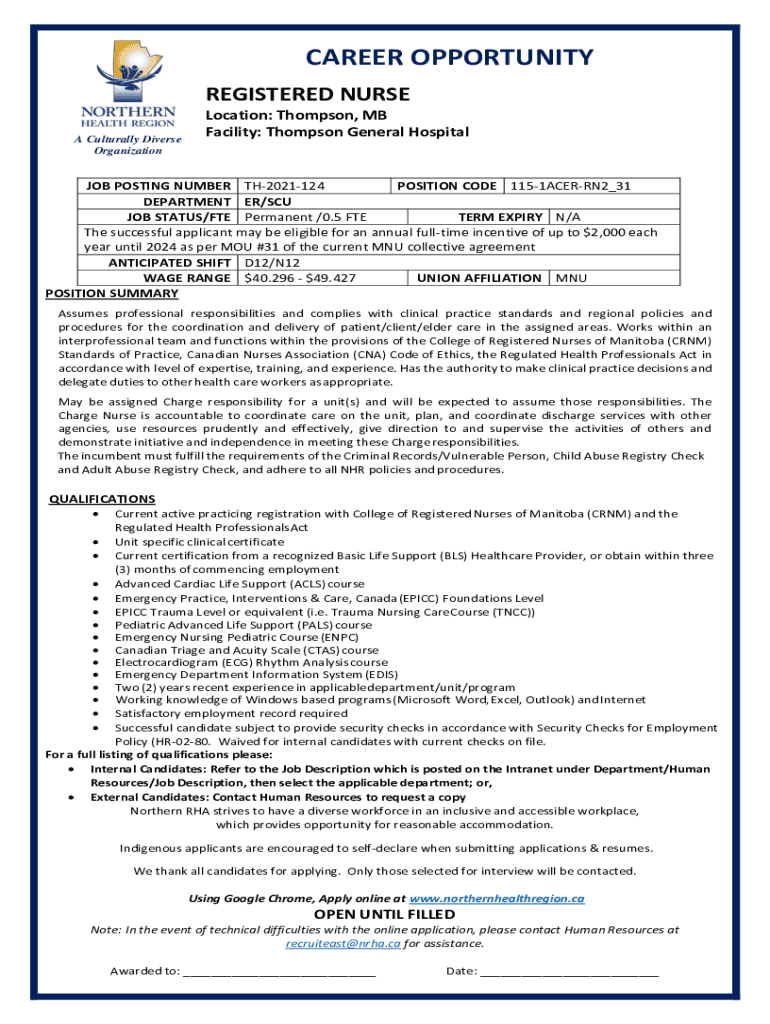 CAREER OPPORTUNITY REGISTERED NURSE A Culturally Diverse OrganizationLocation: Thompson, MB Facility: Thompson General Hospital POSTING NUMBER TH2021124 POSITION CODE 1151ACERRN2_31 DEPARTMENT ER/SCU