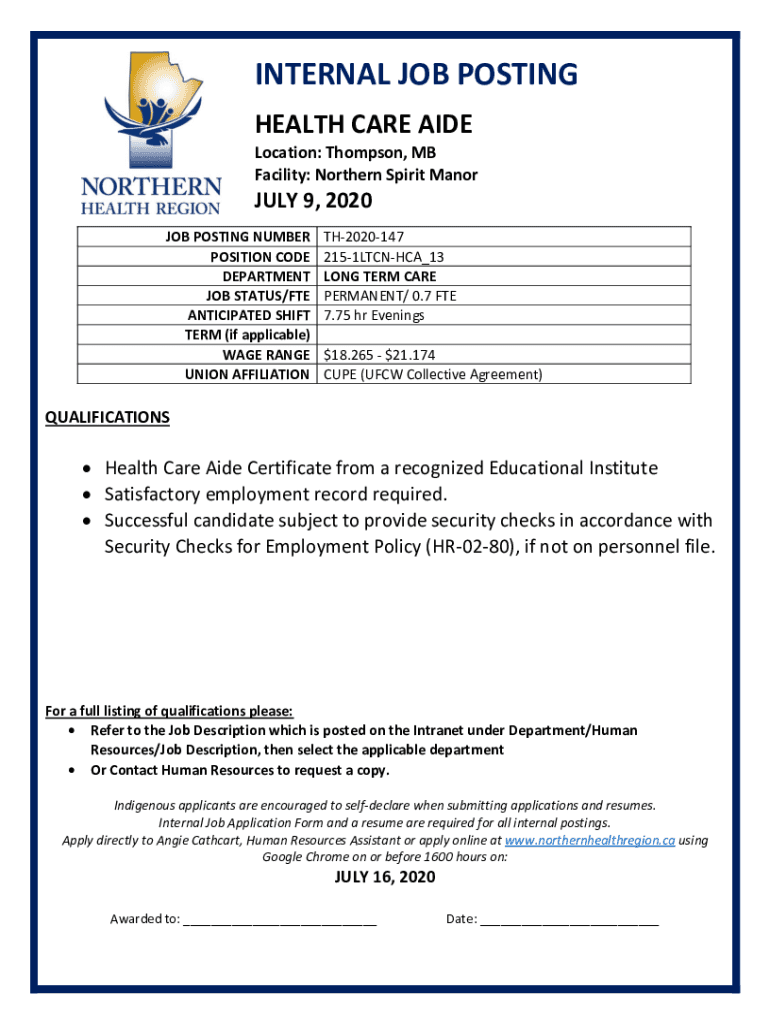 INTERNAL JOB POSTING HEALTH CARE AIDE Location: Thompson, MB Facility: Northern Spirit Manorial 9, 2020 JOB POSTING NUMBER POSITION CODE DEPARTMENT JOB STATUS/FTE ANTICIPATED SHIFT TERM (if applicable)