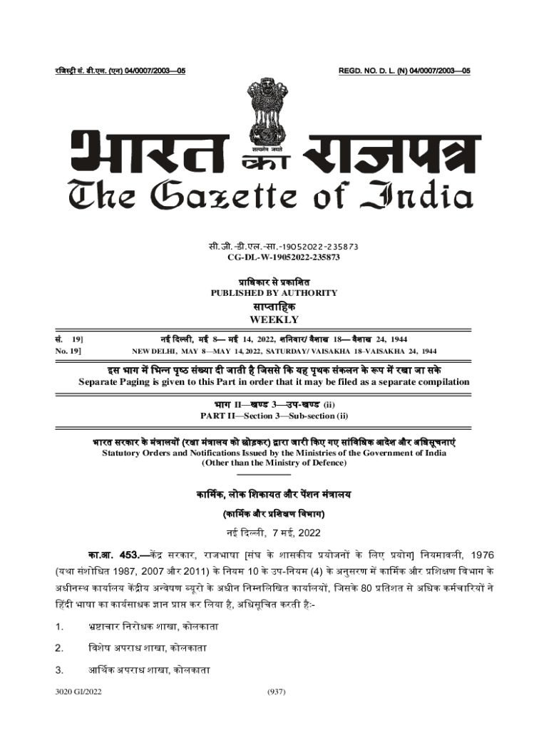. . () 04/0007/200305REGD. NO. D. L. (N) 04/0007/200305.....19052022235873 xxxGIDHxxx xxxGIDExxx CGDLW19052022235873 PUBLISHED BY AUTHORITY WEEKLY. , 8 14, 2022, / 18 24, 194419]No. 19]NEW DELHI,
