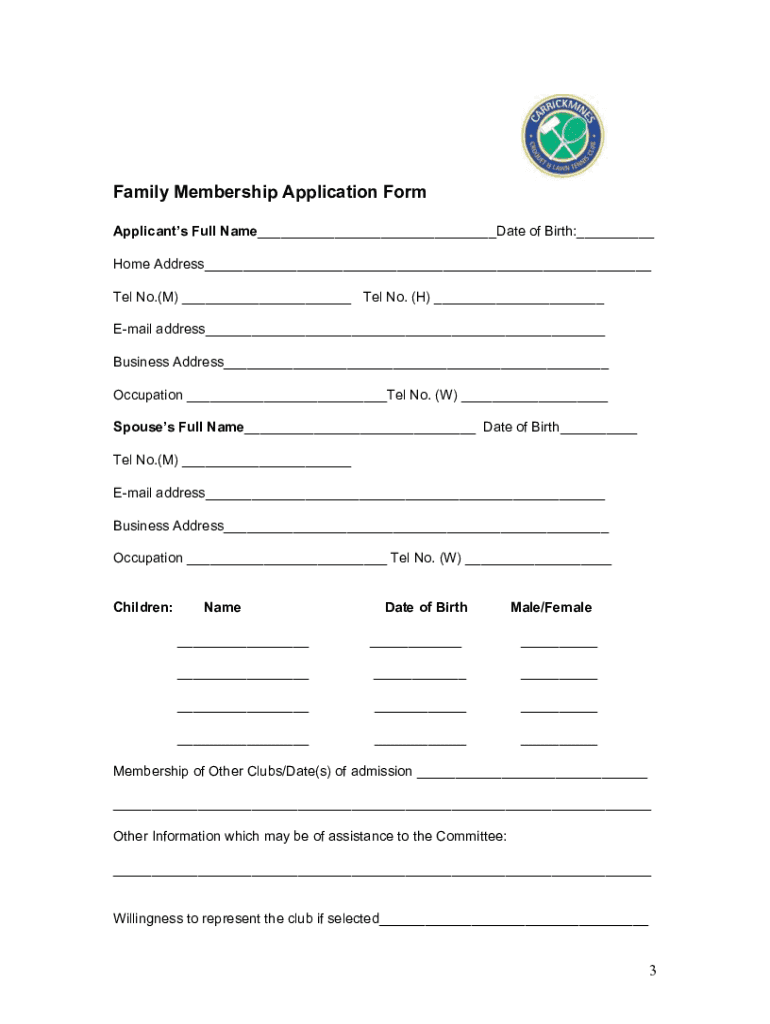 Family Membership Application Form Applicants Full Name___Date of Birth:___ Home Address___ Tel No.(M) ___ Tel No. (H) ___ Email address___ Business Address___ Occupation ___Tel No. (W) ___ Spouses