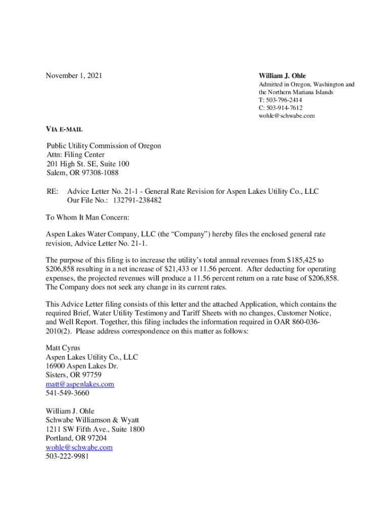 November 1, 2021William J. OHL Admitted in Oregon, Washington and the Northern Mariana Islands T: 5037962414 C: 5039147612 wohle@schwabe.comVIA EMAIL Public Utility Commission of Oregon Attn: Filing