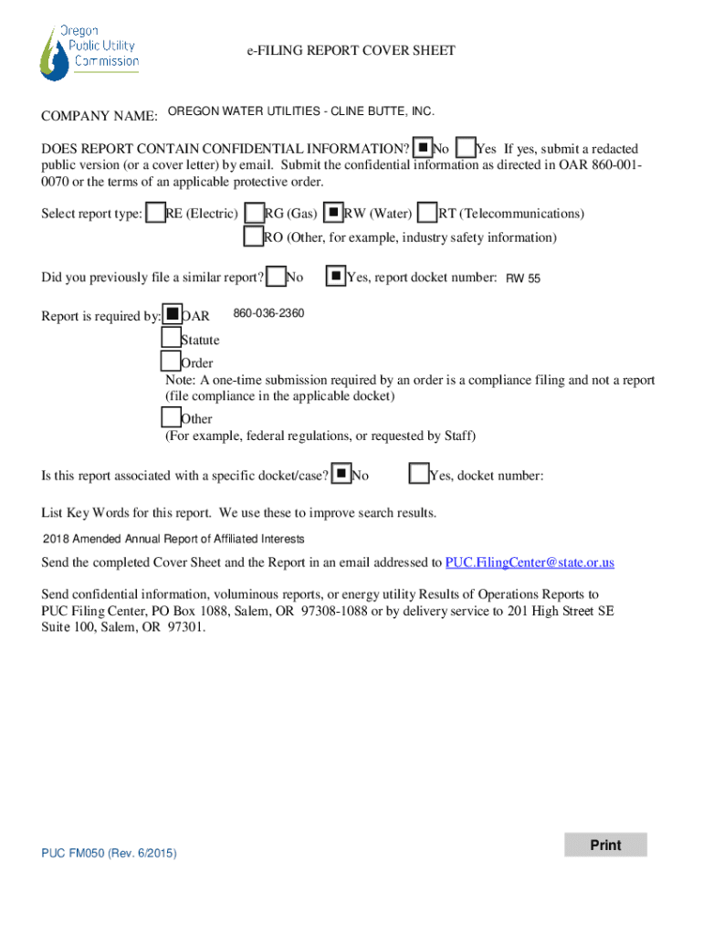 FILING REPORT COVER SHEETCOMPANY NAME: OREGON WATER UTILITIES CLINE BUTTE, INC. DOES REPORT CONTAIN CONFIDENTIAL INFORMATION? No Yes If yes, submit a redacted public version (or a cover letter) by