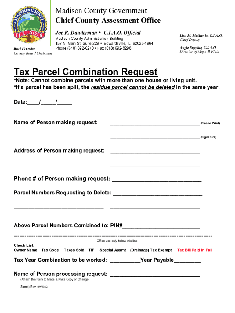 Tax parcel combination requests typically require information such as parcel numbers, legal descriptions of the properties, and reasons for the combination.