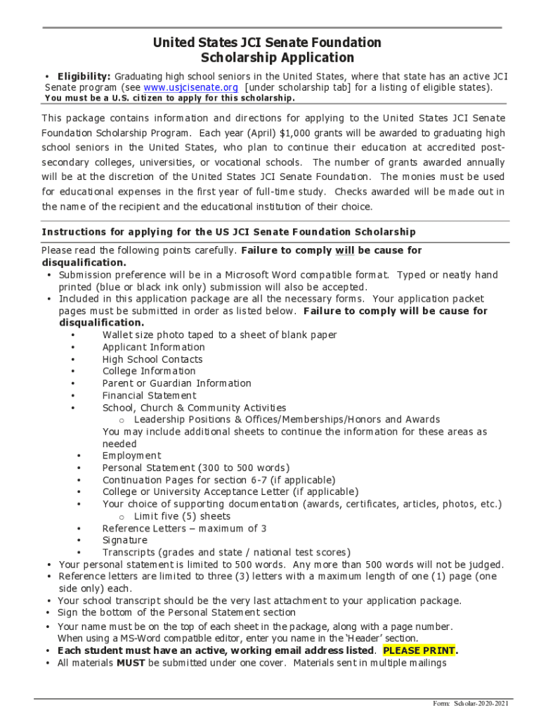 United States JCI Senate Foundation Scholarship Application Eligibility: Graduating from high school seniors in the United States, where that state has an active JCI Senate program (see www.usjcisenate.org