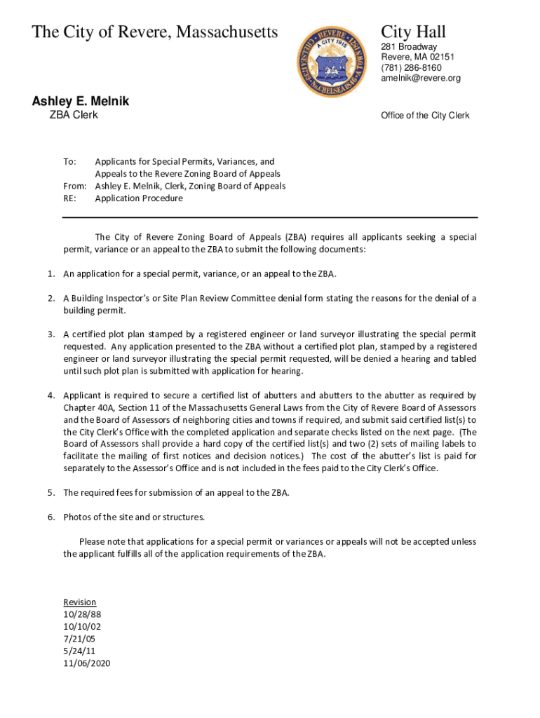 The City of Revere, MassachusettsCity Hall 281 Broadway Revere, MA 02151 (781) 2868160 amelnik@revere.orgAshley E. Melanie CBA ClerkOffice of the City Clerk:Applicants for Special Permits, Variances,