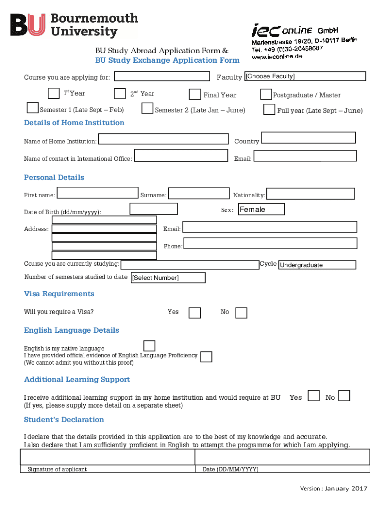 The BU study exchange application is a form used by students to apply for a study exchange program at Boston University.