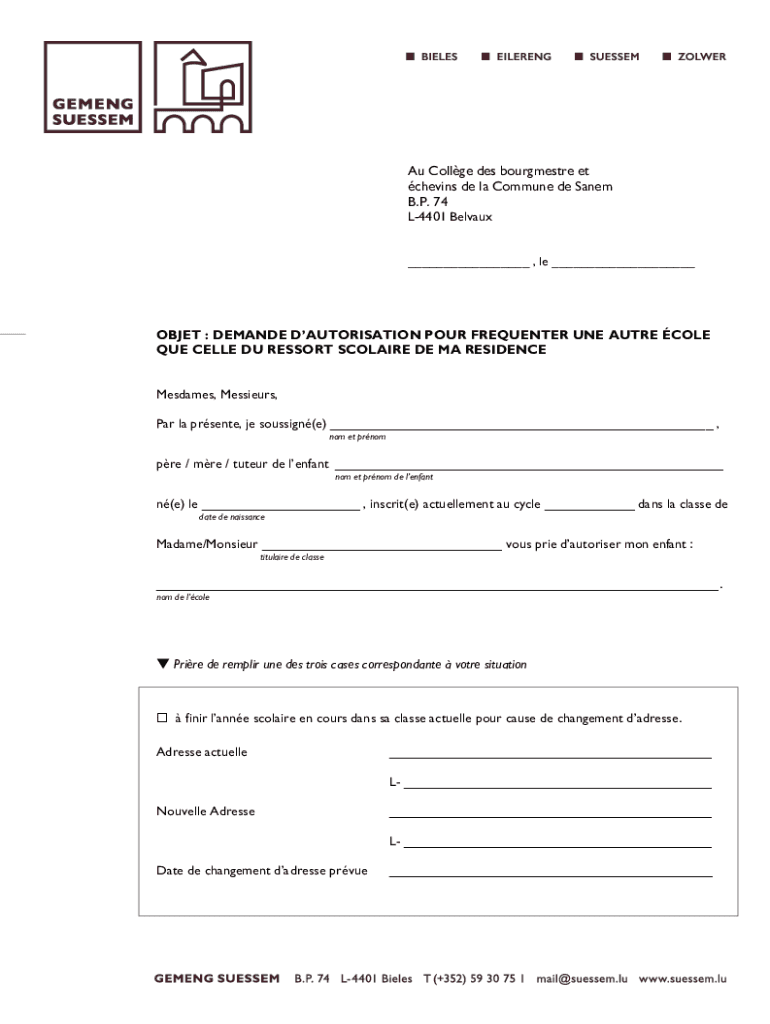 Au College DES bourgmestre et chains DE la Commune de Sanem B.P. 74 L4401 Belau ___, LE ___OBJECT : DEMAND AUTHORIZATION POUR FREQUENTER ONE Outré COLE QUE CELL EDU RESORT CLAIRE DE MA RESIDENCE