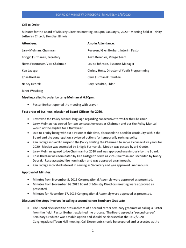 BOARD OF MINISTRY DIRECTORS MINUTES 1/9/2020 Call to Order Minutes for the Board of Ministry Directors meeting, 6:30pm, January 9, 2020, Meeting held at Trinity Lutheran Church, Huntley, Illinois