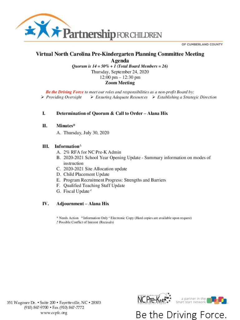 Virtual North Carolina PreKindergarten Planning Committee Meeting Agenda Quorum is 14 50% + 1 (Total Board Members 26)Thursday, September 24, 2020 12:00 pm 12:30 pm Zoom Meeting Be the Driving Force