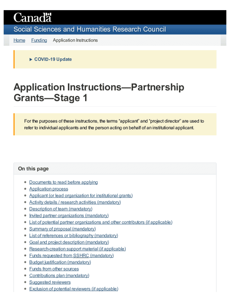 Social Sciences and Humanities Research Council HomeFundingApplication InstructionsCOVID19 UpdateApplication InstructionsPartnership GrantsStage 1 For the purposes of these instructions, the terms