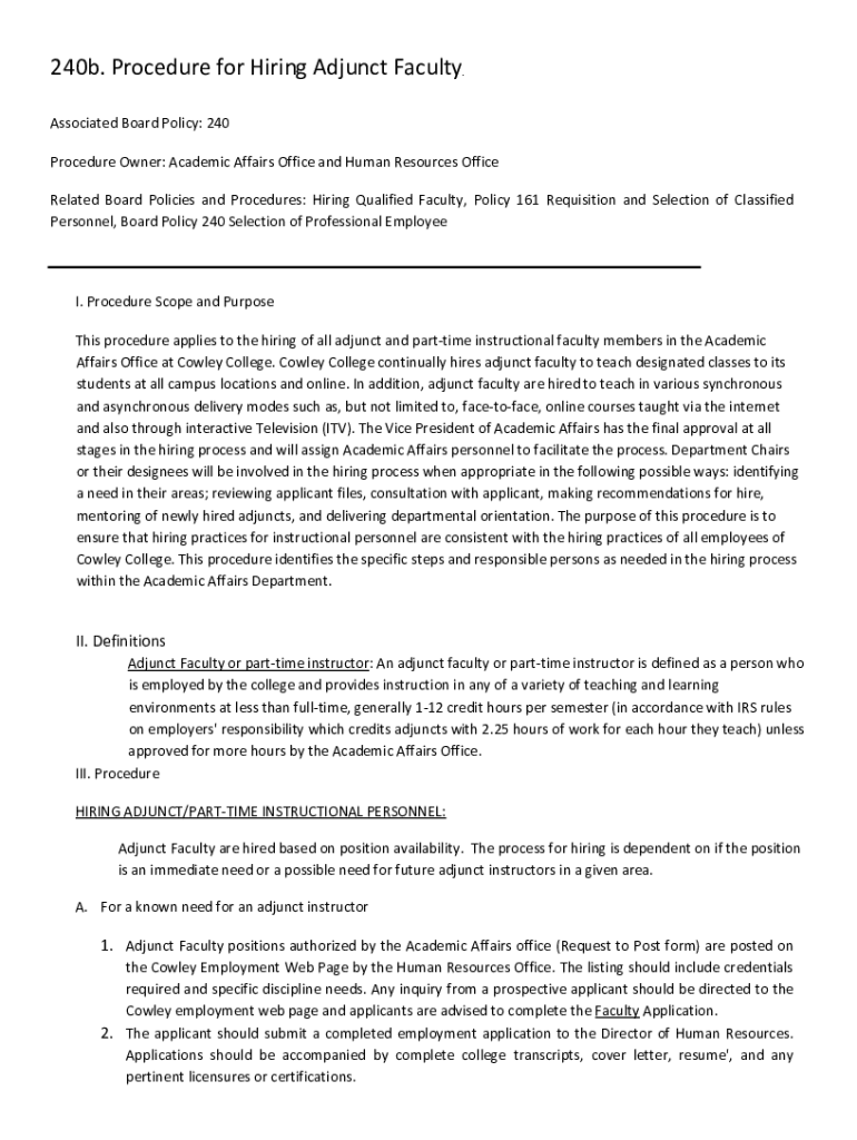 240b. Procedure for Hiring Adjunct Faculty Associated Board Policy: 240 Procedure Owner: Academic Affairs Office and Human Resources Office Related Board Policies and Procedures: Hiring Qualified