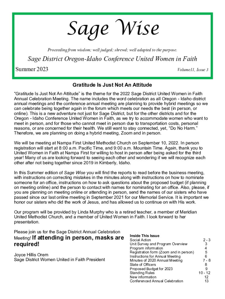 Sage Wise Proceeding from wisdom; well judged; shrewd; well adapted to the purpose. Sage District Oregon Idaho Conference United Women in Faith Summer 2023Volume11, Issue 3Gratitude Is Just Not An