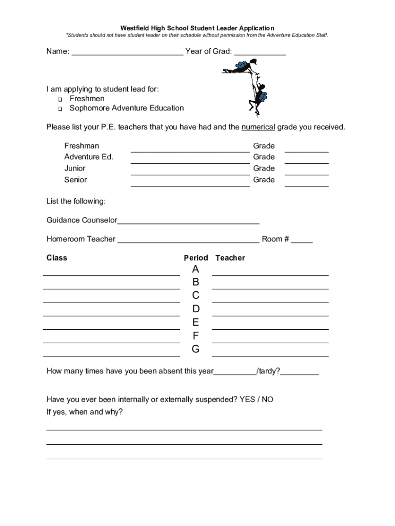 Westfield High School Student Leader Application *Students should not have student leader on their schedule without permission from the Adventure Education Staff.Name: ___ Year of Grad: ___I am applying