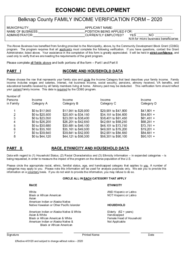 ECONOMIC DEVELOPMENT Belong County FAMILY INCOME VERIFICATION FORM 2020 MUNICIPALITY: NAME OF BUSINESS: ADMINISTRATOR:APPLICANT NAME: ___ POSITION BEING APPLIED FOR: ___ CURRENTLY EMPLOYED? YES ___NO