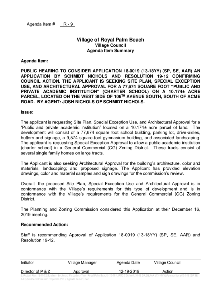 Agenda Item #R9Village of Royal Palm Beach Village Council Agenda Item Summary Agenda Item: PUBLIC HEARING TO CONSIDER APPLICATION 180019 (1318YY) (SP, SE, AAR) AN APPLICATION BY SCHMIDT NICHOLS AND