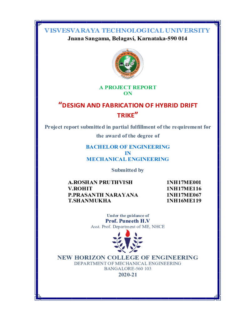 VISVESVARAYA TECHNOLOGICAL UNIVERSITY Jana Panama, Bengali, Karnataka590 014A PROJECT REPORT InDesign AND FABRICATION OF HYBRID DRIFT TRIKE Project report submitted in partial fulfillment of the requirement