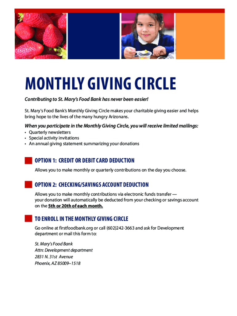 MONTHLY GIVING CIRCLE Contributing to St. Mary's Food Bank has never been easier! St. Mary's Food Banks Monthly Giving Circle makes your charitable giving easier and helps bring hope to the lives