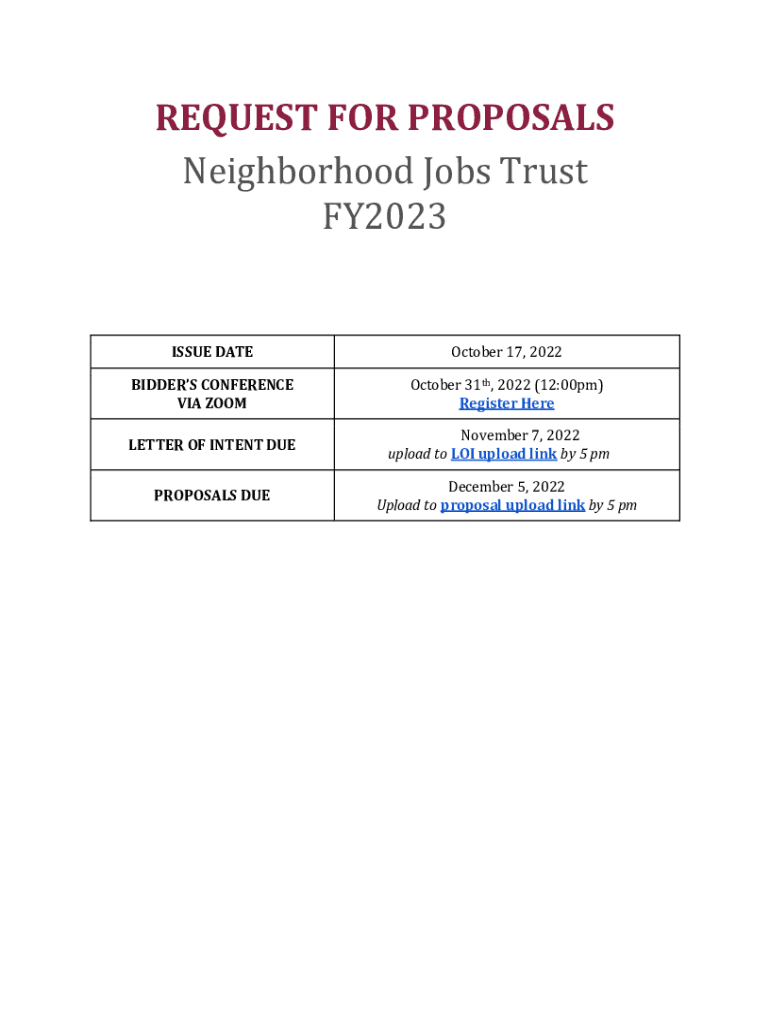 REQUEST FOR PROPOSALS Neighborhood Jobs Trust FY2023ISSUE DATE October 17, 2022BIDDERS CONFERENCE VIA ZOOM October 31st, 2022 (12:00pm) Register Harvester OF INTENT DUE PROPOSALS DUE November 7, 2022,
