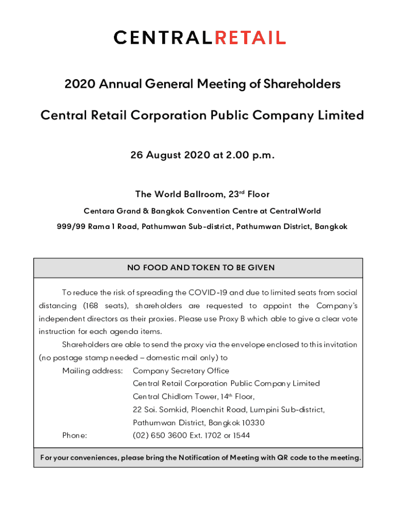 2020 Annual General Meeting of Shareholders Central Retail Corporation Public Company Limited 26 August 2020 at 2.00 p.m. The World Ballroom, 23rd Floor Certara Grand & Bangkok Convention Center at