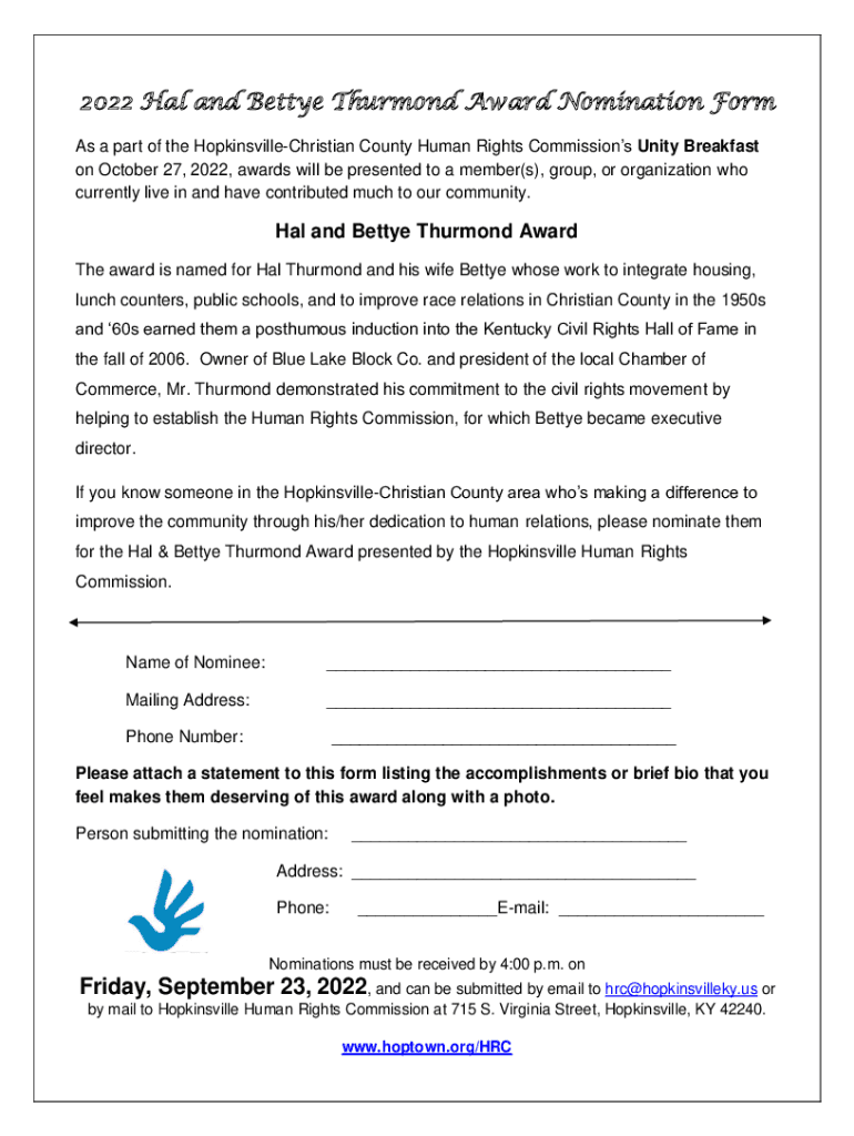 2022 Hal and Bettye Thurmond Award Nomination Form As a part of the HopkinsvilleChristian County Human Rights Commissions Unity Breakfast on October 27, 2022, awards will be presented to a member(s),