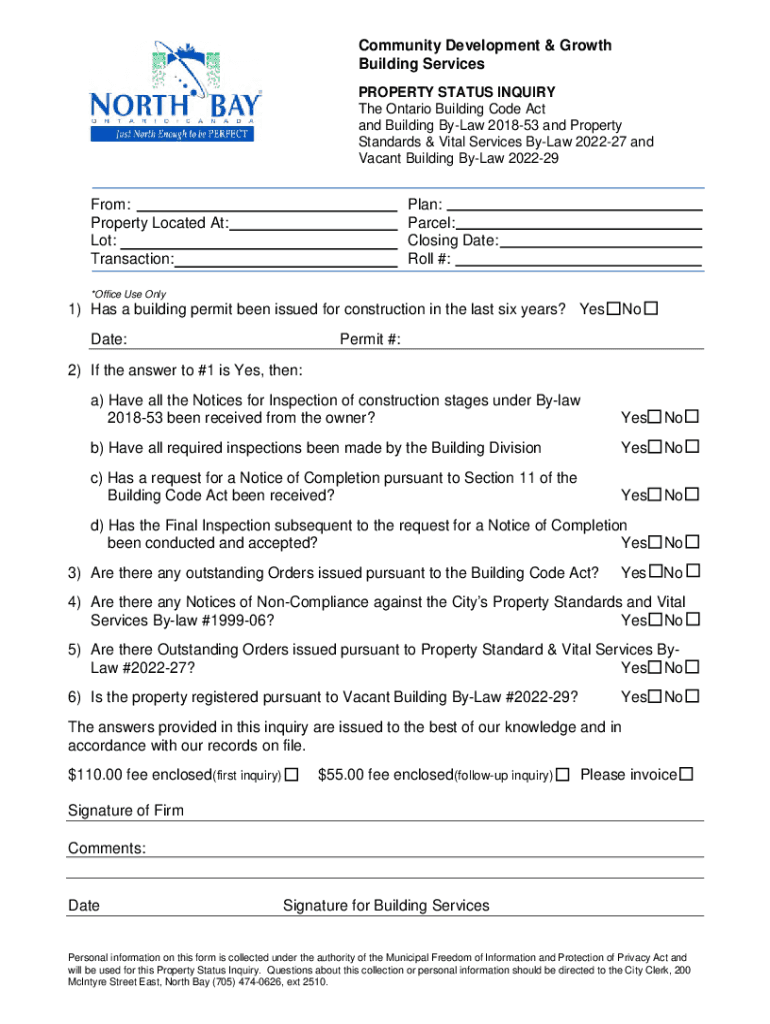 Community Development & Growth Building Services PROPERTY STATUS INQUIRY The Ontario Building Code Act and Building Bylaw 201853 and Property Standards & Vital Services Bylaw 202227 and Vacant Building