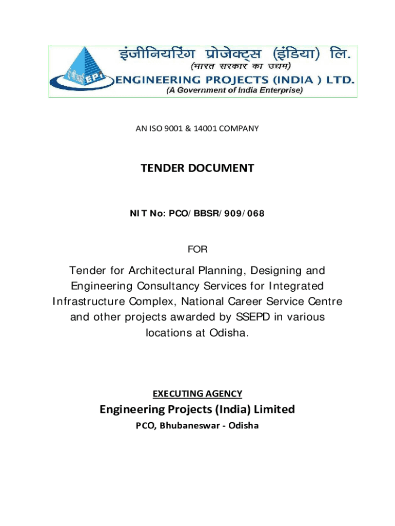 AN ISO 9001 & 14001 COMPANYTENDER DOCUMENT NIT No: PRO/BBS/909/068FORTender for Architectural Planning, Designing and Engineering Consultancy Services for Integrated Infrastructure Complex, National