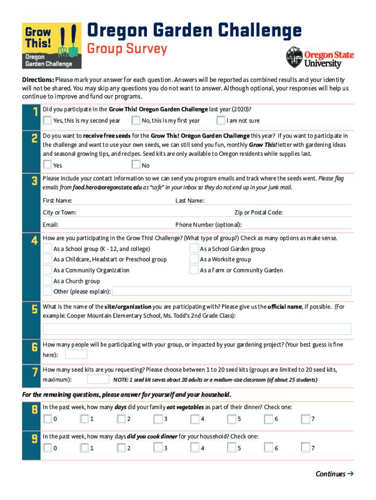 Oregon Garden Challenger This! Group SurveyDirections: Please mark your answer for each question. Answers will be reported as combined results and your identity will not be shared. You may skip any