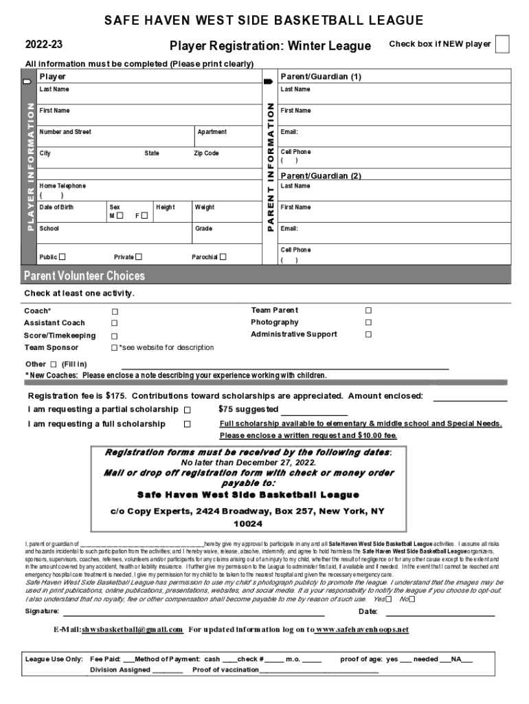 202223Player Registration: Winter League information must be completed (Please print clearly)
