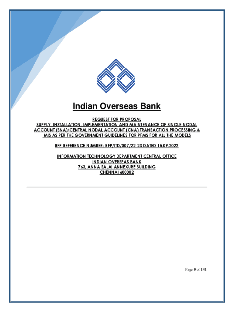 Indian Overseas Bank REQUEST FOR PROPOSAL SUPPLY, INSTALLATION, IMPLEMENTATION AND MAINTENANCE OF SINGLE NODAL ACCOUNT (SNA)/CENTRAL NODAL ACCOUNT (CNA) TRANSACTION PROCESSING & MIS AS PER THE GOVERNMENT