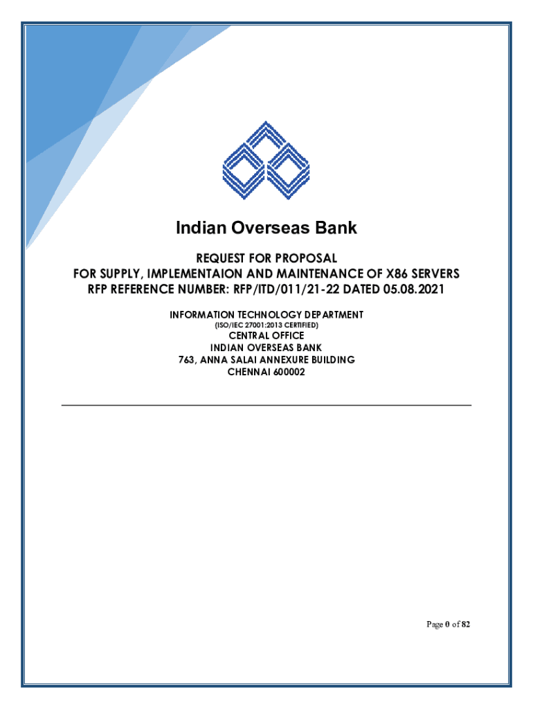 Indian Overseas Bank REQUEST FOR PROPOSAL FOR SUPPLY, IMPLEMENTATION AND MAINTENANCE OF X86 SERVERS RFP REFERENCE NUMBER: RFP/IT/011/2122 DATED 05.08.2021 INFORMATION TECHNOLOGY DEPARTMENT (ISO/IEC